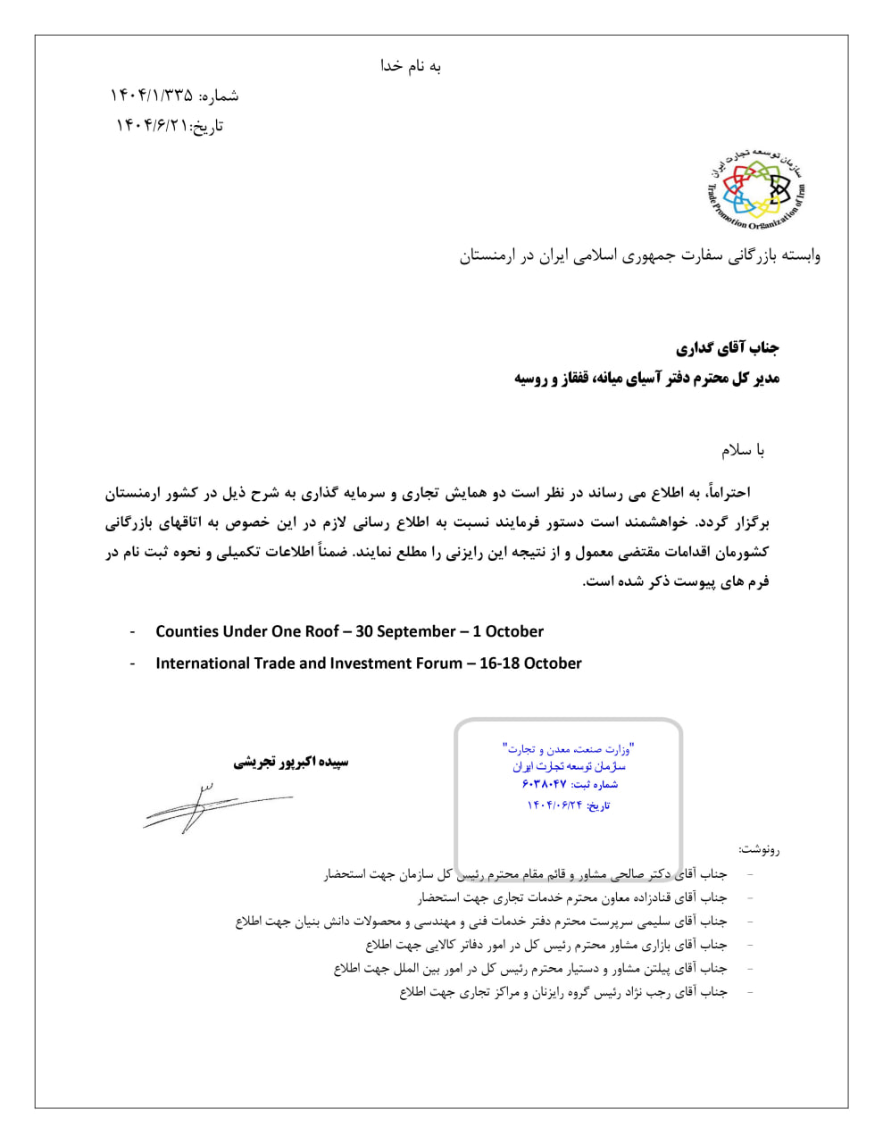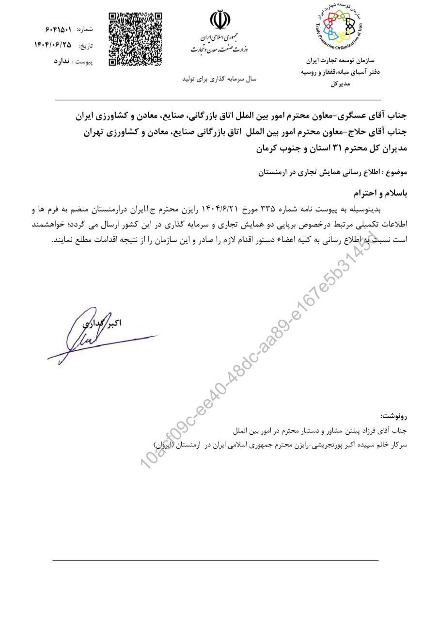 اطلاع رسانی همایش تجاری در ارمنستان در تاریخ ۱۴۰۴-۰۷-۰۵ نویسنده: Ramezani لینک کوتاه https://qssez.ir/?p=12039